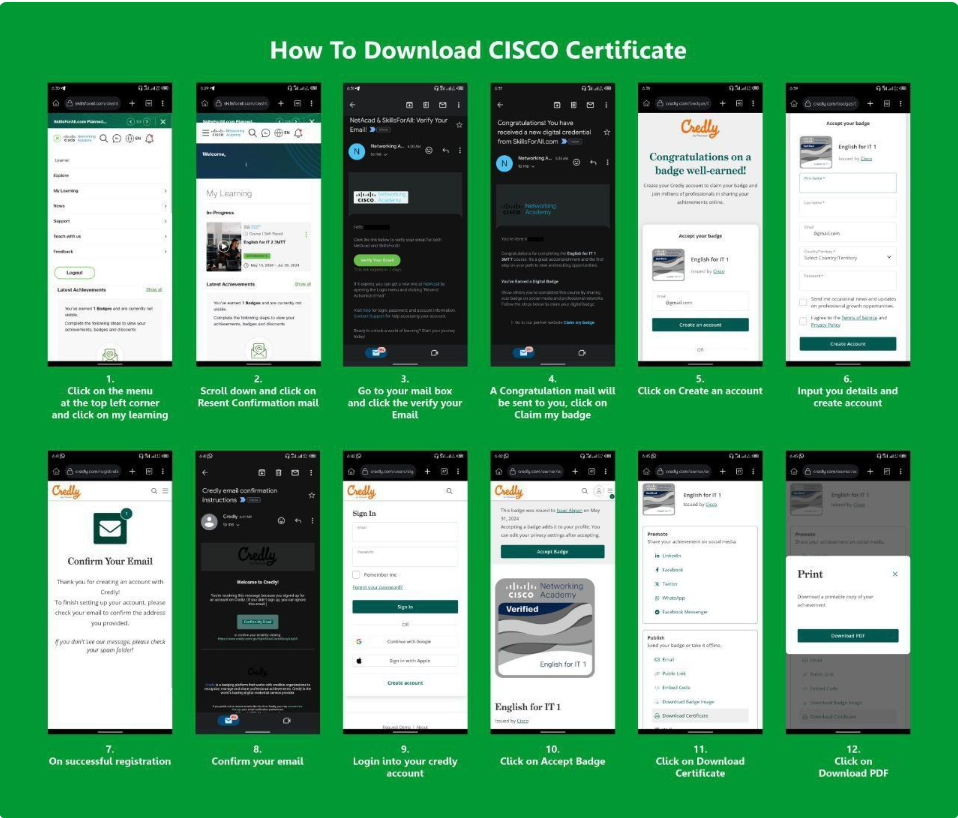 2. Set Up Your Credly Account: After verifying your email, you will be redirected to Credly. Set up your Credly account as prompted.3. Claim Your Badge: You will receive a congratulatory email from Credly. Open this email and click on "Claim Badge."4. Print Your Certificate: After claiming your badge, click on the "Share" option. Scroll down and click on "Print Certificate." Your certificate will be downloaded to your phone.5. Share Your Achievement: Remember to share your certificate on your social media platforms to celebrate your accomplishment!Important Reminder:Do not click on "Test Now"